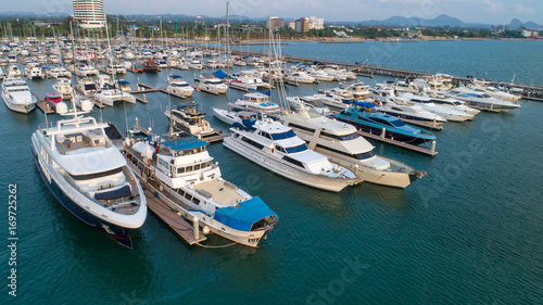 © MAGNIFIER, Fototapeta premium Pier speedboat. A marina lot. This is usually the most popular tourist attractions on the beach.Yacht and sailboat is moored at the quay.Aerial view by drone.Top view.