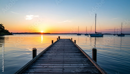 © sori, Fototapeta premium Pier stretches into calm water during golden sunset, boats on horizon
