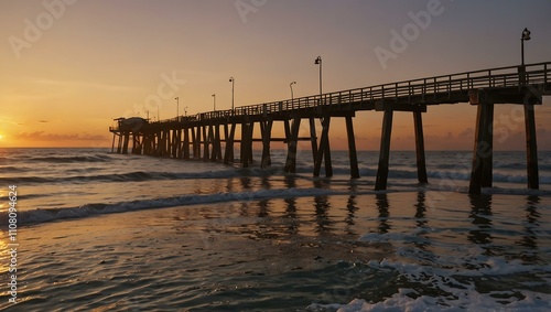 Fototapeta premium Pier stretching into the ocean at sunset with gentle waves.