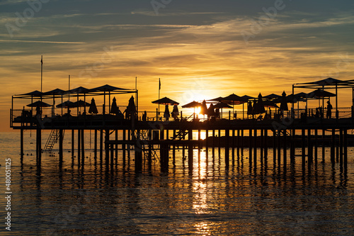 Fototapeta premium pier with umbrellas and sunbeds. silhouettes. beautiful sunset on sea.