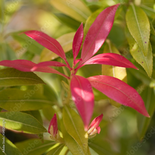 © A Linscott, Fototapeta premium Pieris with red and green leaves in spring, England, United Kingdom