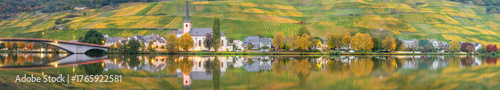 © Pawel Pajor, Fototapeta premium Piesport village and St. Michael church reflected in Moselle river. Germany