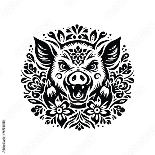 Obraz premium Pig in folk art black and white silhouette illustration -