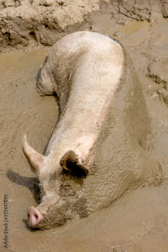 Fototapeta premium Pig sleeping in a mud bath with half of his body covered with mud.