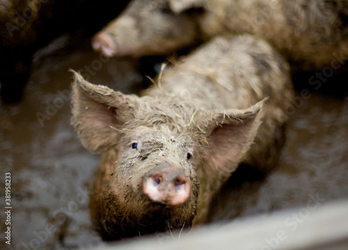 © 936800, Fototapeta premium pig with fur in the mud. farm