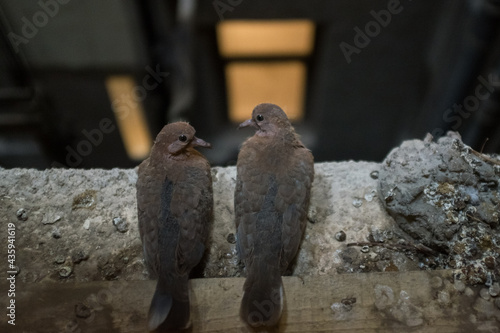 © Orhan Çam, Obraz premium pigeon couple sitting on a window sill in a building elevator shaft