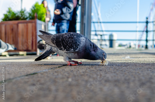 Obraz premium Pigeon eating bread on a sidewalk path. Unrecognisable people in background with bright blue sky.