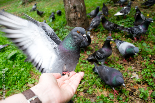 Obraz premium Pigeon eats with my hands