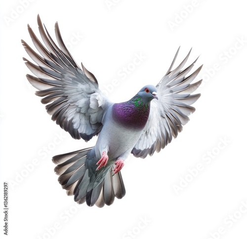 © El Media, Obraz premium Pigeon Flying with Spread Wings on White Background - Bird in Flight