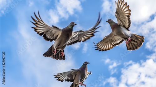 Obraz premium Pigeon in flight against the blue sky, pigeons in flight