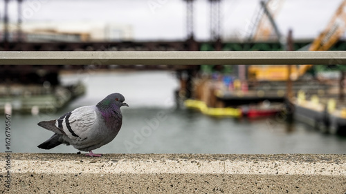 Obraz premium Pigeon perched on railing overlooking urban waterfront with distant bridge