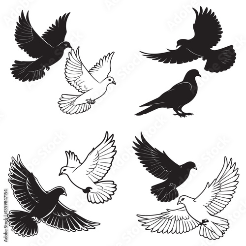 Fototapeta premium Pigeon silhouette, flying dove silhouette vector on white background