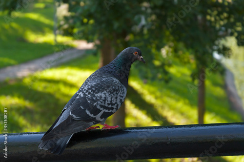 © Yuliya Kiyko, Obraz premium Pigeon sits on a metal handrail in the park