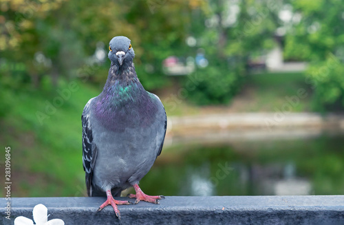 © Valemaxxx, Obraz premium Pigeon sits on a metal railing in a city park.