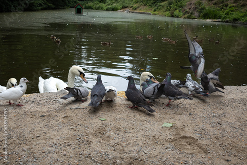 Fototapeta premium Pigeons and a swan feeding by the edge of a peaceful park pond