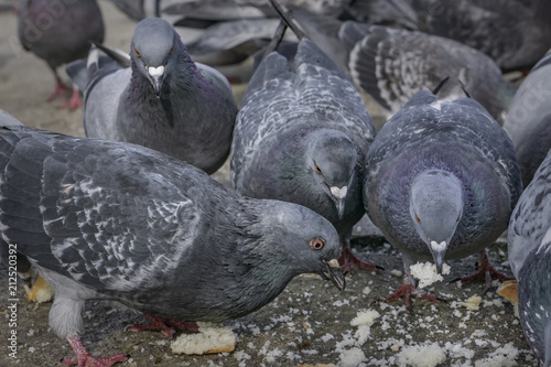 © FedBul, Obraz premium Pigeons in the park eating bread crumbs