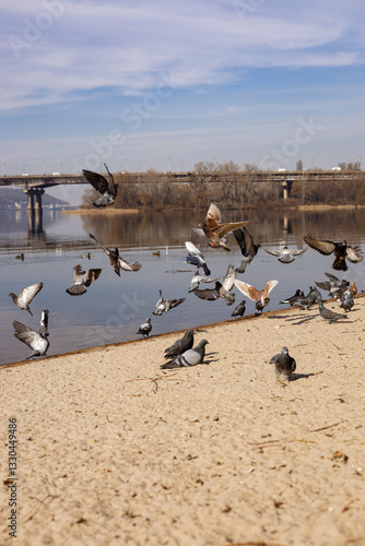 © Yuliia, Obraz premium pigeons on the beach