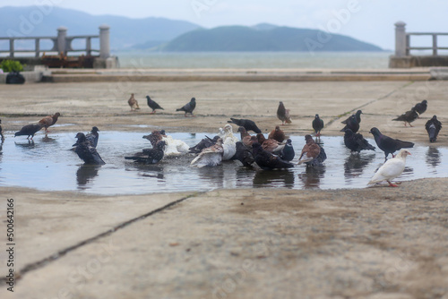 © Minh Chung Bui, Obraz premium Pigeons shed their feathers in a puddle at the park