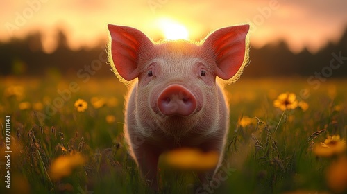 © muhammad, Fototapeta premium Piglet stands in a flower-filled field bathed in warm sunset light