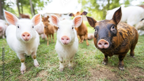 © WATMA_COLLECTIONS, Fototapeta premium Piglets pasture playful farm animals background