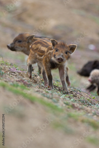© bmf-foto.de, Fototapeta premium Piglets stray across a road and fields in India and one stops and looks at the camera