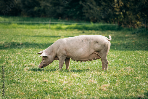 © EwaStudio, Fototapeta premium Pigs eating on a meadow in an organic meat farm