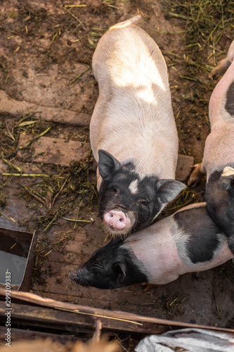 © Kate, Fototapeta premium Pigs family in pigsty, dirty and happy. Farm life