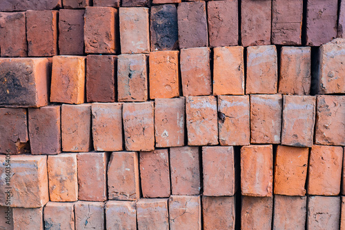 © Manuela, Fototapeta premium Pila ordenada de ladrillos de arcilla con textura áspera y tonos cálidos para construcción