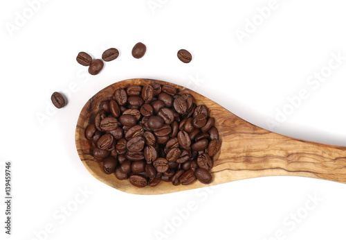 © dule964, Obraz premium pile coffee beans and wooden spoon isolated on white, top view