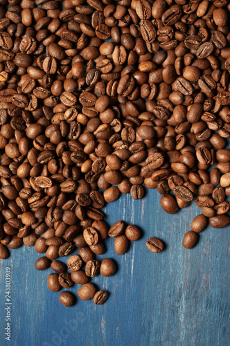 Naklejka premium Pile of coffee beans on blue wood