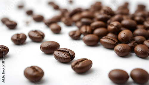 © ridho, Naklejka premium Pile of dark brown glossy coffee beans arranged on a clean white background.