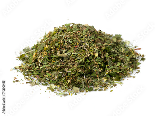 Fototapeta premium pile of dried green tea leaves isolated over the white background