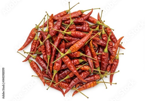 © PixelPulse Creative, Fototapeta premium Pile of dried red chili peppers on a white background, ready for cooking