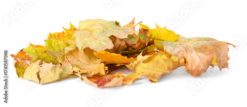 Obraz premium Pile of dry leaves isolated on white. Autumn season
