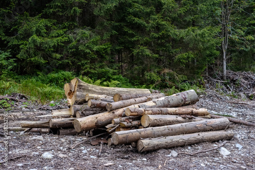 © Martins Vanags, Obraz premium pile of freshly cut log wood in forest