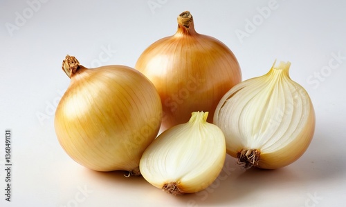 © Valfiyy, Fototapeta premium Pile of golden onions, some halved, showcasing fresh and natural ingredients