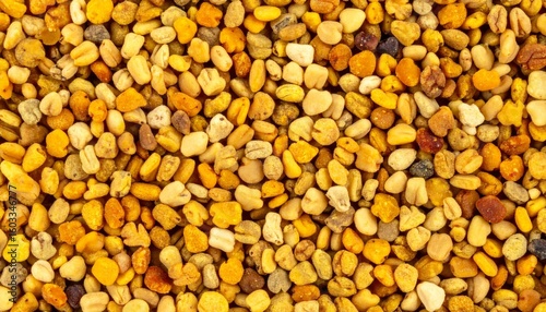 © Pure Imagination, Fototapeta premium Pile of Multicolored Bee Pollen Grains in Golden Hues Full Frame Composition