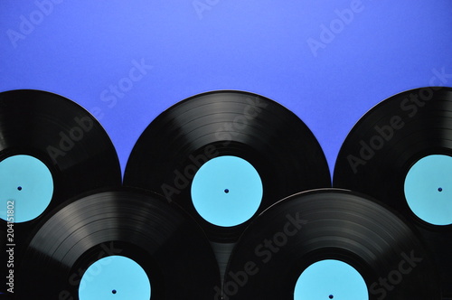 Obraz premium pile of old black vinyl records with blank cyan labels on blue background