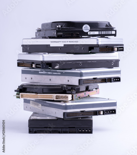 © catto32, Obraz premium Pile of old hard drive on white background.