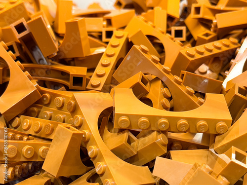 © Marina Chernivetskay, Naklejka premium Pile of orange lego bricks for creative building