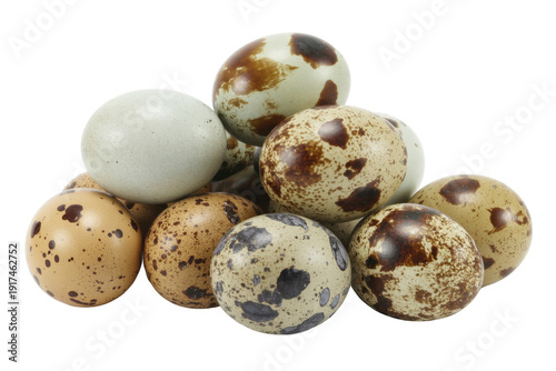 Fototapeta premium Pile of quail eggs on white background brown spots isolated on a transparent background