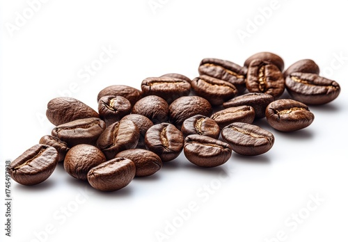 © WHO, Obraz premium Pile of Roasted Brown Coffee Beans on White Background with Intricate Texture and Pattern