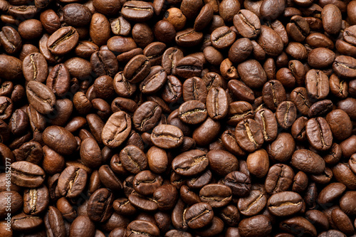 © New Africa, Fototapeta premium Pile of roasted coffee beans as background, top view