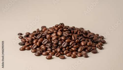 Naklejka premium Pile of Roasted Coffee Beans, Freshly Brewed Aroma, Ready for Grinding, Neutral Background.