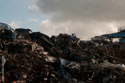 Obraz premium Pile of scrap metal at a junk yard with a metal structure on the side and a...