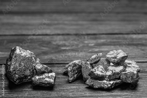 © New Africa, Naklejka premium Pile of silver nuggets on black wooden table. Space for text