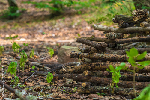 Fototapeta premium Pile of stacked firewood in the forest