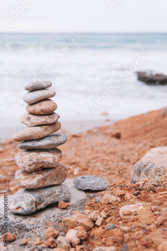 Fototapeta premium Pile of stacked stones with mediterranean sea horizon. Ibiza Sa Caleta