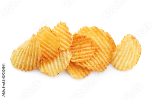 © New Africa, Fototapeta premium Pile of tasty ridged potato chips isolated on white, top view