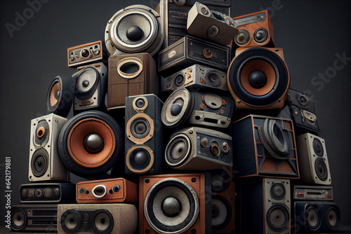 Obraz premium Pile of vintage audio speaker systems. Music retro background, abstract illustration.